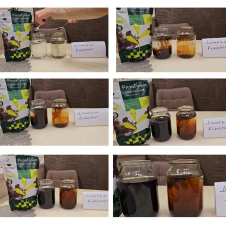 РизоГумат 100% розчиняється у воді та не має осаду, в той час дешевий аналог випадає в осад та розчинність мінімальна.