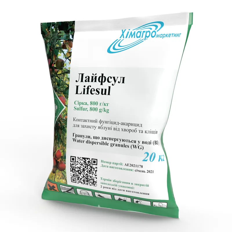 Действующее вещество: 800 г / кг Сера Формуляция: г ранулы, что диспергируются в воде Назначение: в идиум, б орошниста роса Тара: 15 кг Культура: виноград, яблоня