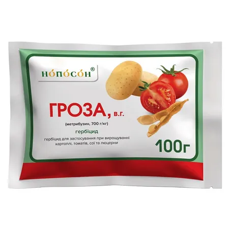 Призначення селективний гербіцид ґрунтової дії (соя, картопля, кукурудза, томати), страховий гербіцид (картопля, томати)Склад метрибузин, 700 г/кгФорма гранули, які диспергуються у водіКультури соя, картопля, кукурудза, томати, люцерна другого року, ехінацеяОб'єкт однорічні дводольні та злакові