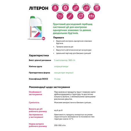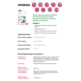 Літерон – ґрунтовий досходовий гербіцид системної дії для контролю однорічних злакових та деяких дводольних бур’янів.