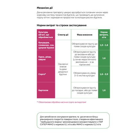 | Кукурудза, соняшник, соя, цукрові буряки | Однорічні злакові та деякі дводольні бур’яни | Обприскування ґрунту до появи сходів культури | 1 - 1,6 |