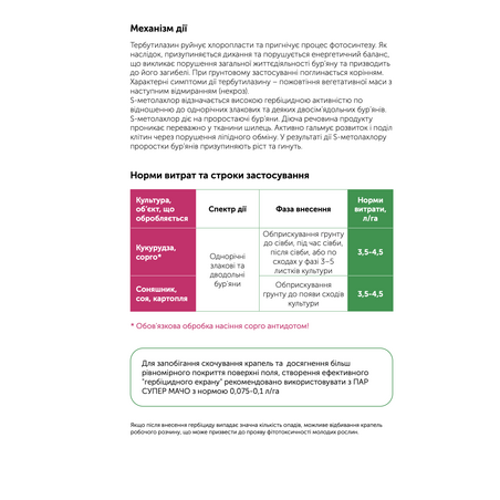 Двокомпонентний селективний досходовий гербіцид ґрунтової та листкової дії проти широкого спектру бур’янів на посівах кукурудзи, соняшника, сої, сорго та плодоовочевих Діюча речовина – S-метолахлор 312,5 г/л + тербутилазин 187,5 г/л Препаративна форма – концентрат суспензії Тара – 20 л