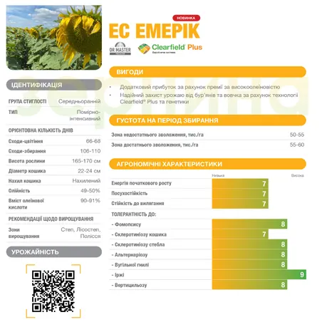 Генетический потенциал урожайности: 55 ц/га Группа спелости: Группа спелости: 110-112 дней Тип: Интенсивный Высота растения: 180-190 см Масличность: 47-50% Рекомендуемые зоны выращивания: Степь, Лесостепь, Полесье Устойчивость к заразихе: A-Е Мешок: 150тыс семян