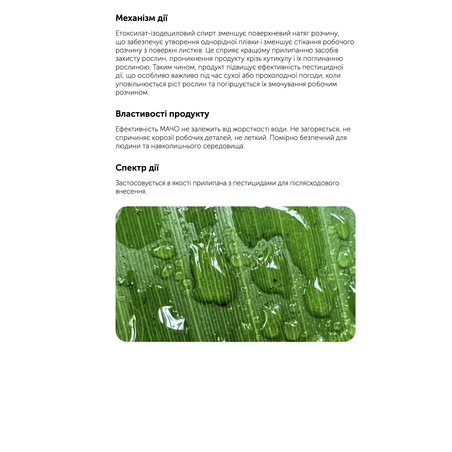 Діюча речовина: мінеральна олія + жирні спирти Формуляція: концентрат емульсії Призначення: прилипач, який зменшує поверхневий натяг наносимого розчину Тара: 10 л