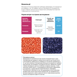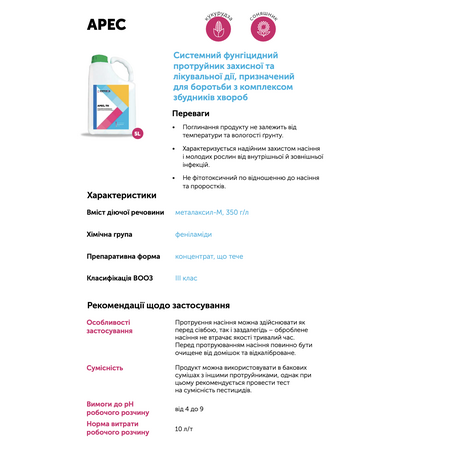 Діюча речовина: 350 г/л металаксилу–М Формуляція: емульсія для обробки насіння Призначення: кореневі гнилі, пероноспороз, бактеріоз, несправжня борошниста роса, вертицильоз, біла гниль, коренеїд Тара: 5 л Культура: кавун, капуста, морква, огірки, соняшник, цибуля, цукрові буряки