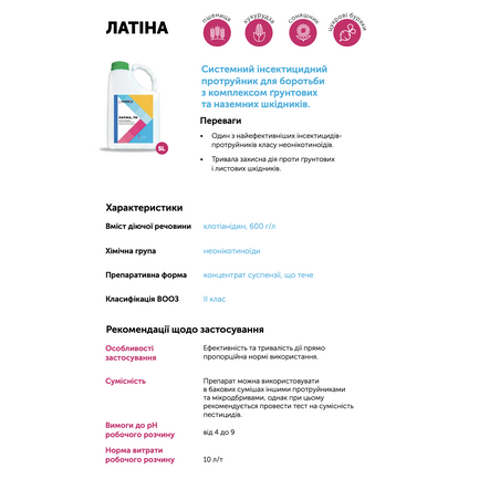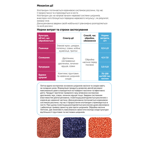 Протруйник Латіна – системний інсектицидний протруйник для боротьби з комплексом ґрунтових та наземних шкідників.