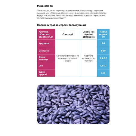 Действующее вещество: 350 г / л тиаметоксам Формуляция: текучий концентрат суспензии Назначение: комплекс грунтовых и посходових вредителей, крестоцветные и рапсовое блошки, капустный и рапсовый прихованохоботникы, тли, проволочника, ненастоящие проволочника, личинки майских жуков Культура сорго, подсолнечник, рапс, пшения озимая, лен, кукуруза,...
