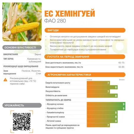 Пластичный гибрид с высоким потенциалом производительностиИСПОЛЬЗОВАНИЕ Зерно Зерно ТИП ЗЕРНА Кременисто-зубовидный Зона выращивания: Степь, Лесостепь, Полесье ФАО 240 80тыс семян