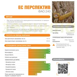 Пластичный гибрид с высоким потенциалом производительностиИСПОЛЬЗОВАНИЕ Зерно Зерно ТИП ЗЕРНА Кременисто-зубовидный Зона выращивания: Степь, Лесостепь, Полесье ФАО 240 80тыс семян