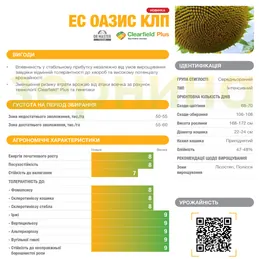 Група стиглості: середньостиглий Тип: лінолевий Орієнтовний період вегетації: 114–118 Вміст олії: 46 - 49 % Висота рослини: висока