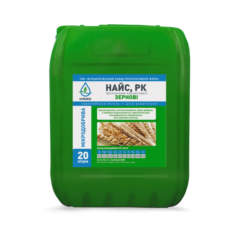 Сірка, що входить до складу добрива, дозволяє більш ефективно використовувати рослиною азотні добрива, які сприяють збільшенню відсотка білка і клейковини в пшениці. Марганець і мідь у поєднанні з природним комплексом амінокислот активізують синтез лігніну, який відіграє важливу роль у захисті від патогенів (збудників хвороб борошнистої роси, іржі та ін.), а також сприяють підвищенню стійкості рослин до вилягання. Застосування комплексу Найс Зернові на зернових культурах в період кущення дозволить рослинам більш ефективно використовувати азотні добрива, закласти повноцінні генеративні органи і, як результат, збільшити кількість колосків у колосі. Застосування у фазах від прапорцевого листка до колоса оптимізує процес фотосинтезу з подальшою трансформацією пластичних речовин в зернівки.